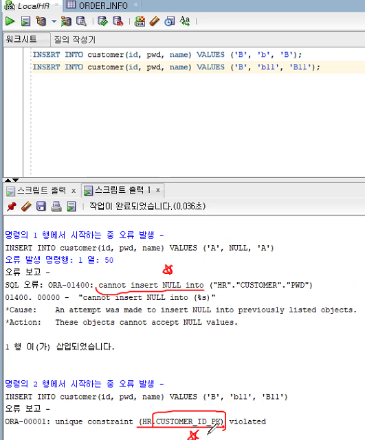 INSERT INTO order_info(order_no, order_id) VALUES (1,'X'); -- HR.ORDER_INFO_NO_PK violated