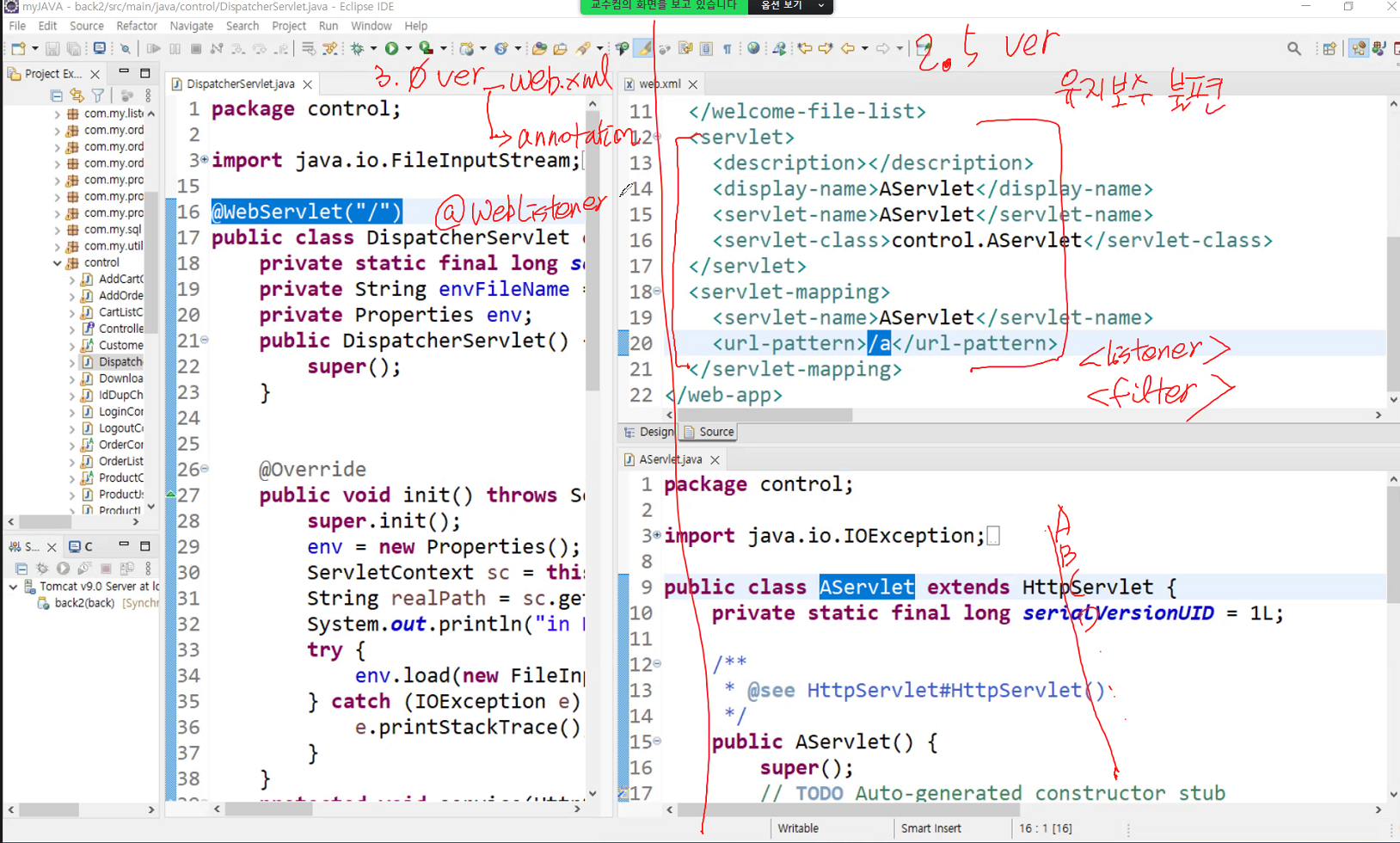 서블릿, 필터, 리스너가 어떤 것들이 있는지.