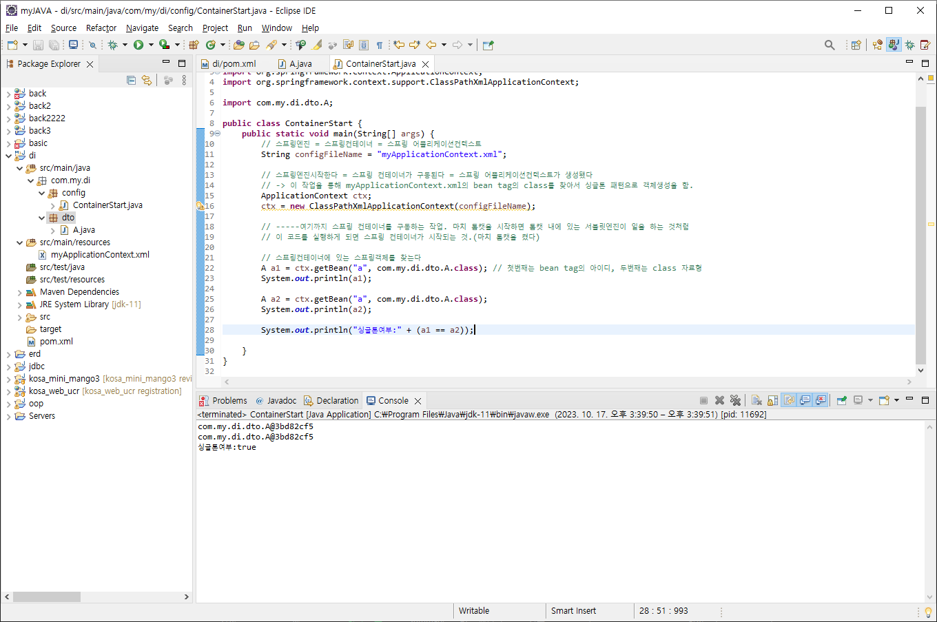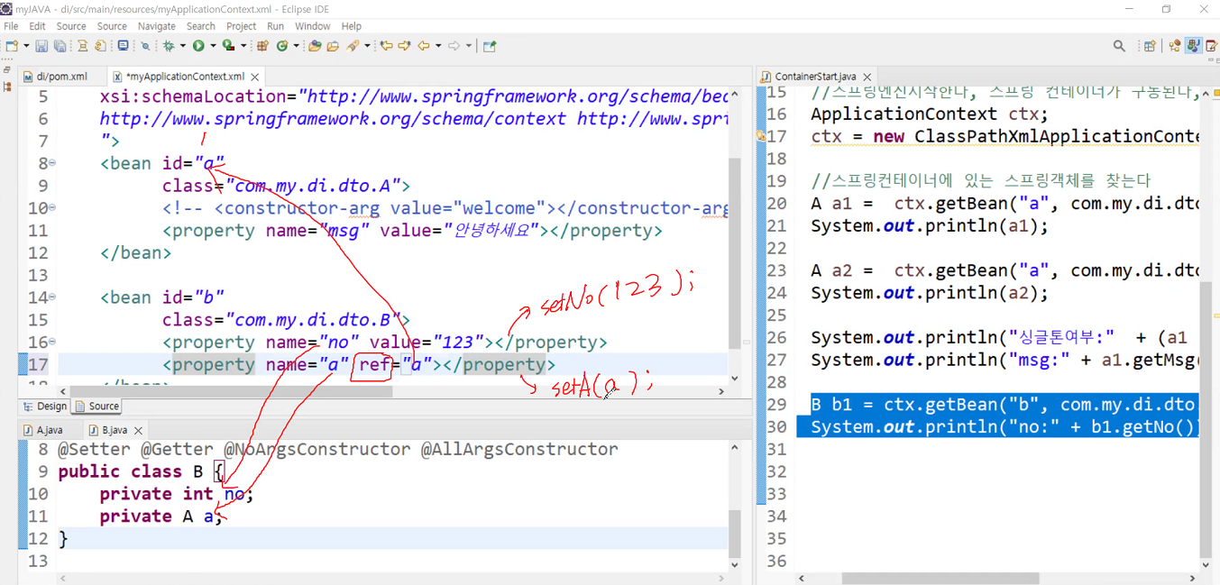 A a1 = ctx.getBean("a", com.my.di.dto.A.class); // 첫번째는 bean tag의 아이디, 두번째는 class 자료형