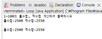 System.out.println("1~100의 홀수합, 짝수합 계산하여 출력하시오");