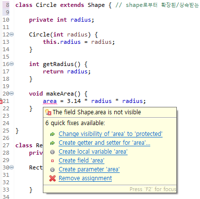 class Circle extends Shape { // shape로부터 확장된/상속받는 class이다. 자식 쪽에서 부모를 결정한다. 부모로부터 상속받으면 자식 class가 간결해짐. 재사용성이 높아짐.
