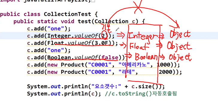 ※ 박싱(boxing) : 기본 자료형을 해당하는 참조 자료형으로 변환하는 과정, 기본 타입의 값을 포장 객체로 만드는 과정. 포장 클래스 변수에 기본 타입 값이 대입할 때 발생. 기본 자료형 값을 그에 해당하는 래퍼 클래스(wrapper class)로 감싸서 참조 자료형으로 만듭니다. 기본형(int) → 참조형(Integer) → Object로 업캐스팅