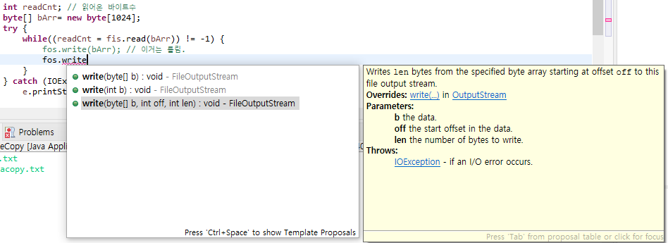 파일 복사의 원리는 FileInputStream에서 읽은 바이트를 바로 FileOutputStream으로 출력하는 것.