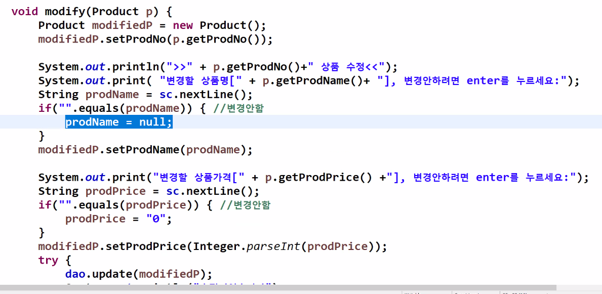 Product.java에서 → private int prodPrice; 말고 Integer prodPrice;로 사용하면 된다.