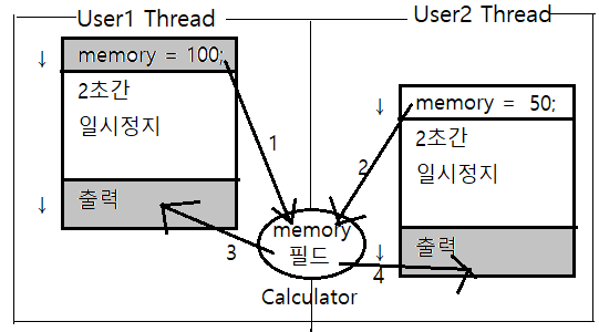 그동안 User2Thread가 memory 필드값을 50으로 변경한다. 2초가 지나 User1Thread가 다시 실행상태가 되어