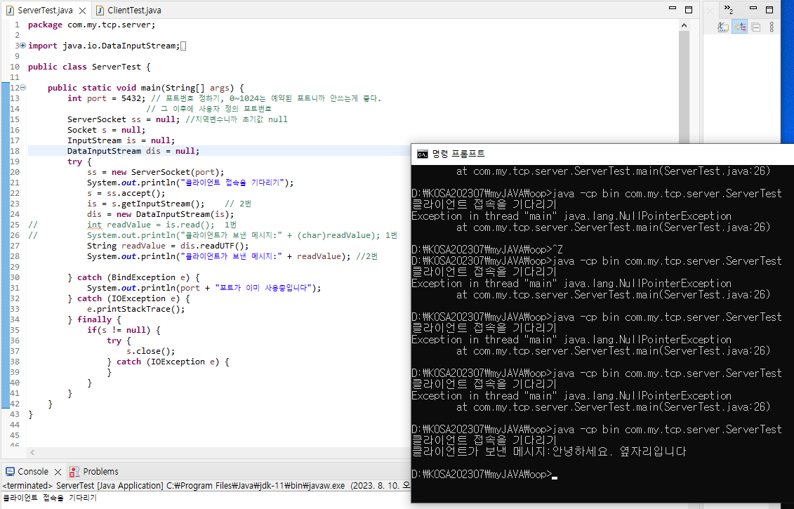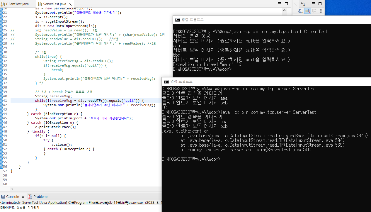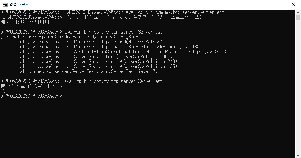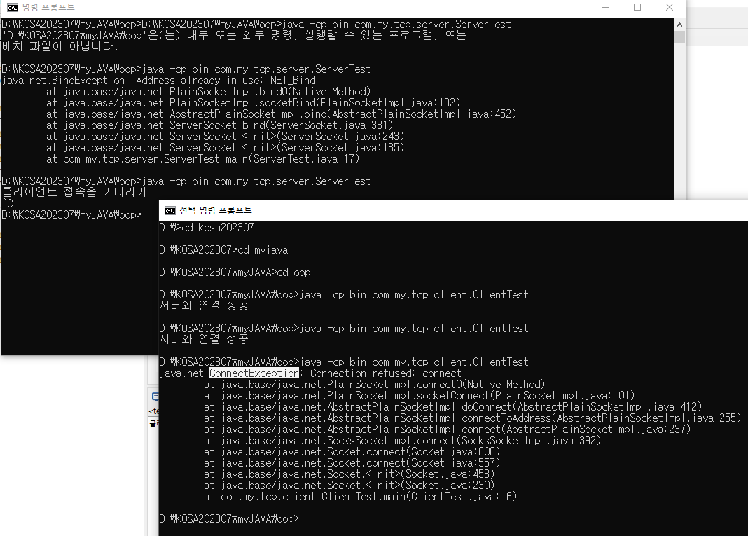 콘솔창 2개 띄우기 번거로워서 cmd로 실행. 클래스 실행은 패키지명.클래스 명, 항상 서버부터 실행하기