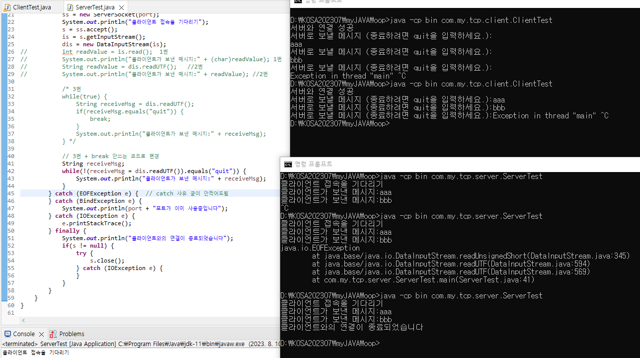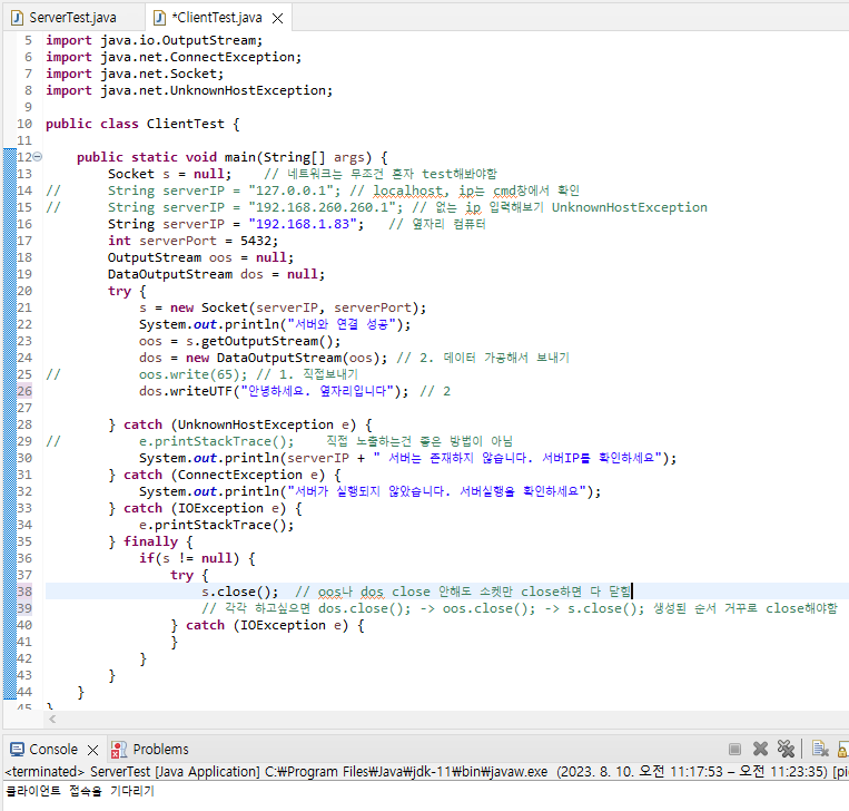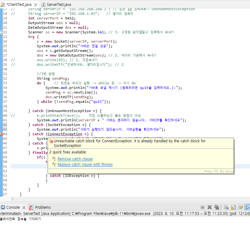 서버 키고 잘못된 ip로 실행해보면 예외처리한걸로 감