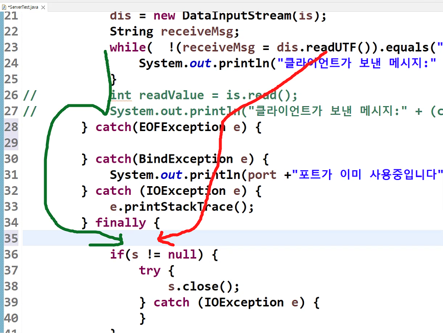 서버 입장에선 정상종료이건 exception 들렀다오건 finally 오면 종료니까 그냥 연결이 종료되었습니다