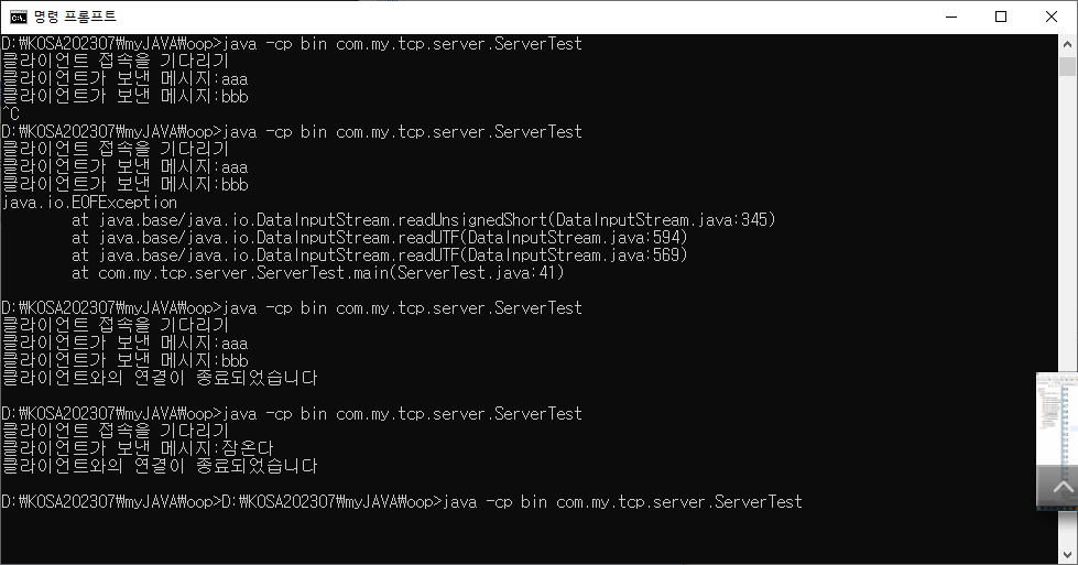 System.out.println("클라이언트와의 연결이 종료되었습니다");