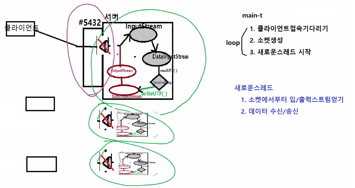 ※ 클라이언트 별 메인에 의해 서버사이드에 소켓 만들어지고, 새로운 스레드 시작