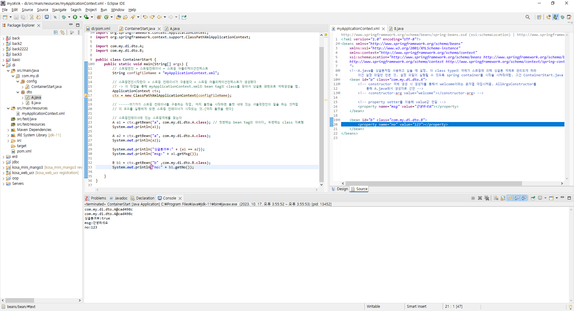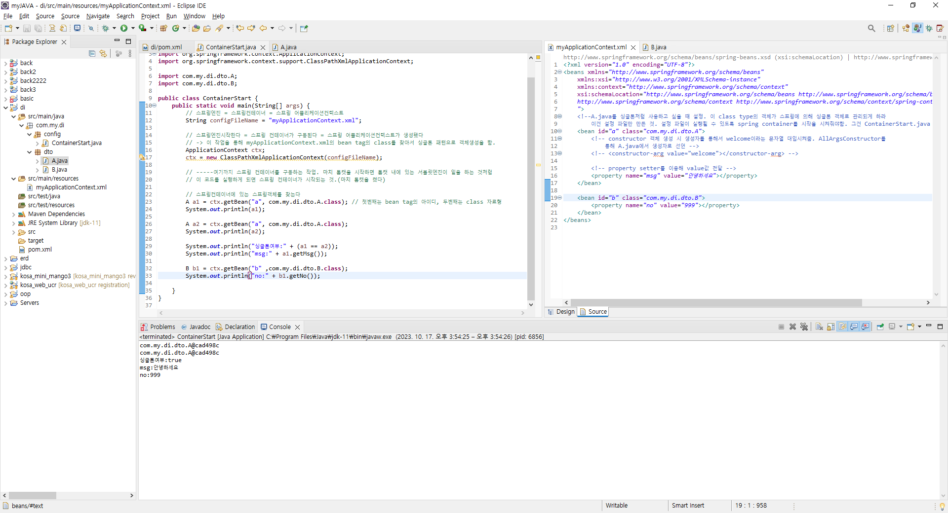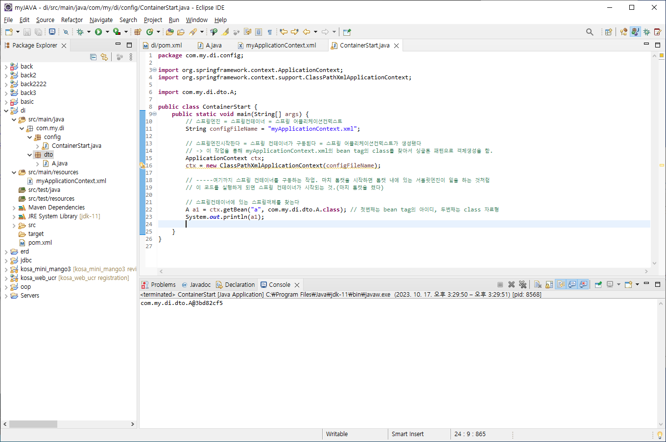 A a1 = ctx.getBean("a", com.my.di.dto.A.class); // 첫번째는 bean tag의 아이디, 두번째는 class 자료형